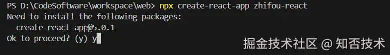 如果你电脑本地之前没有安装过 create-react-app,第一次安装会询问你是否安装,输入 y 即可。