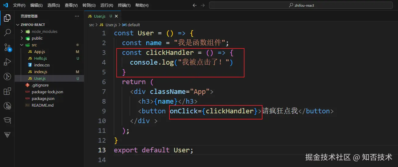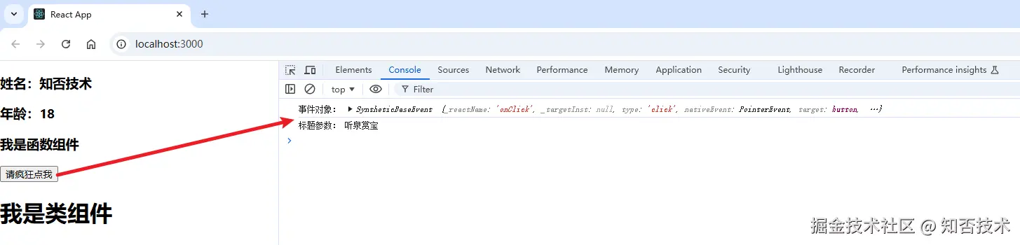 <button onClick={(e) => this.clickHandlerThree(e, "知否技术")}>我是类组件,请疯狂点我</button>