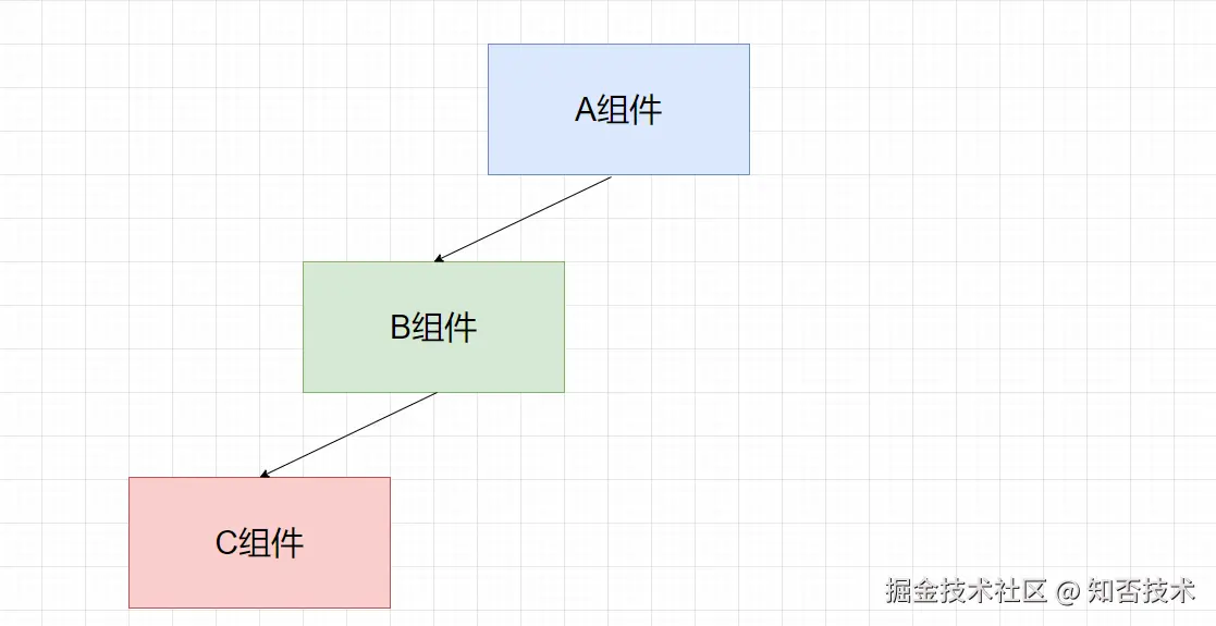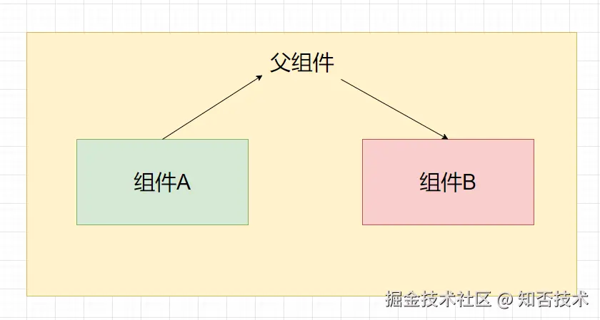 实现原理:组件 A 将数据传给父组件,父组件再将数据传给 B 组件。