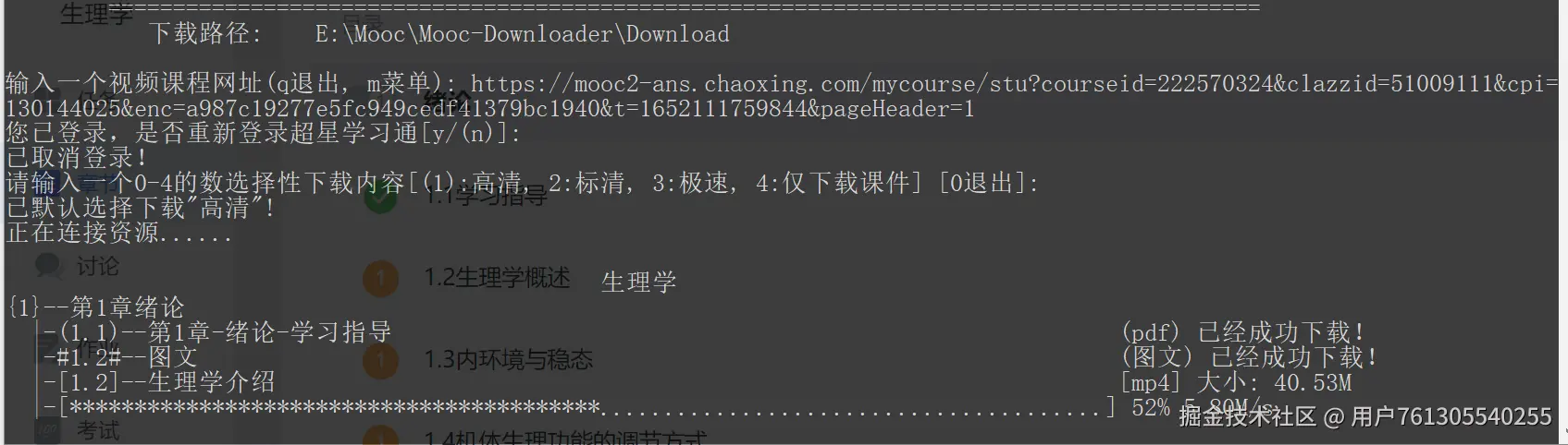 3.然后粘贴到下载器中,并按要求输入指令,会自动下载相应课程的视频和课件