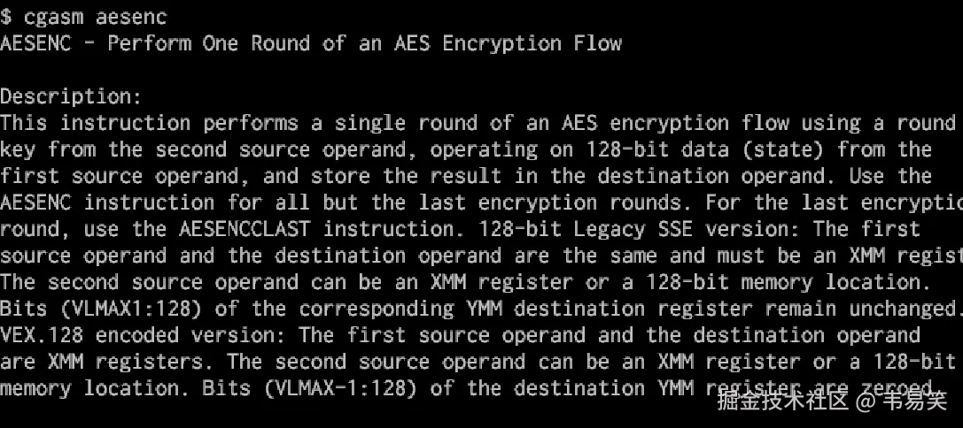 当然,具体使用你会需要看更详细的说明,那么可以使用 cgasm -v aesenc,将会显示和开发手册 PDF里一致的内容:指令字节码,编码模式,状态影响,伪操作码描述和等价的 Intrinsic 等详细内容,比搜网页和查询 PDF效率高多了。