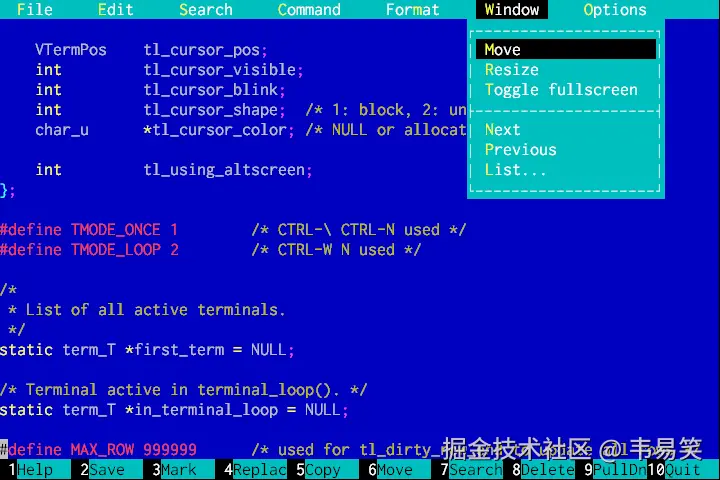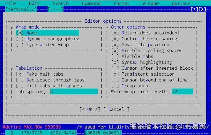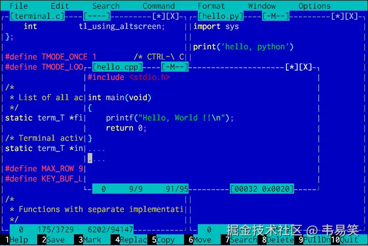 怀旧的同志们也许还会想起以前的 Borland C++ 3.1,对吧?冲这点就赢得了我不少好感,说太多也没必要,基本都是鼠标点点点就知道大概的用法了,有这玩意儿,可以让你在 nano 和 vim/emacs 中间多一个负责任的选择。