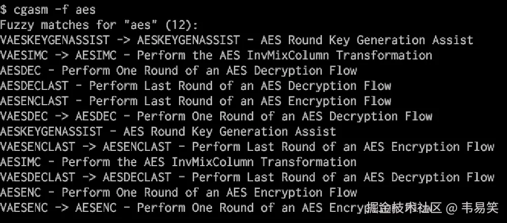 Intel x86/x64 开发者手册,上千页的 PDF 里漫游,效率很低,对不对?cgasm 支持本地模糊搜索,比如查询 aes 相关的指令: