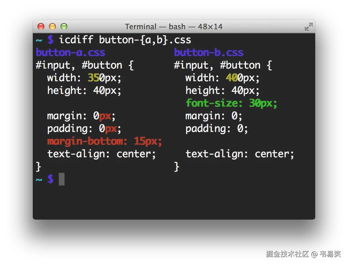 比传统 diff 更明白些,是吧?效果比 sdiff 好不少,还可以配置到 git 里,变成默认的 git diff查看工具,比原来的 diff 漂亮不少吧?