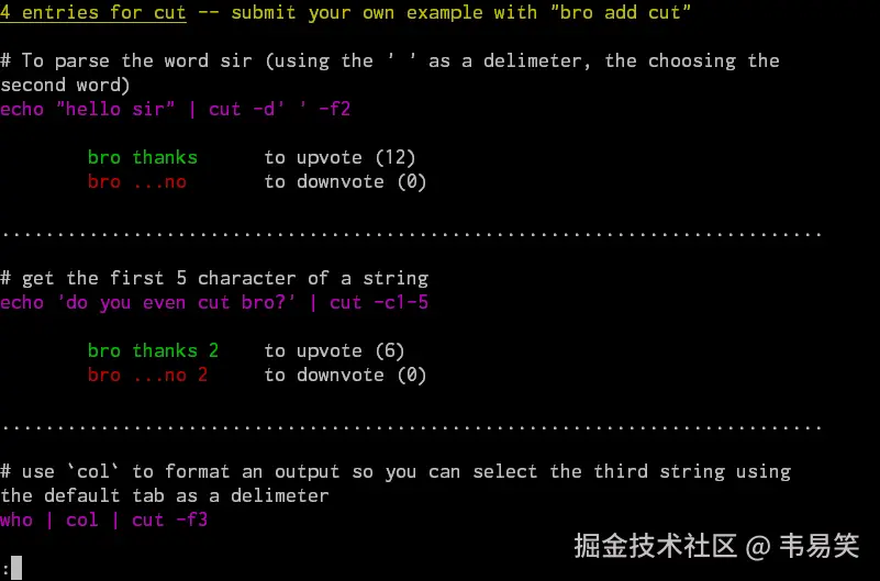 比如我们查看 cut 命令的帮助,就运行 “bro cut”,显示内容如图,查看按投票多少排序,你如果觉得哪条解释比较好,你可以投赞成票,或者反对票。