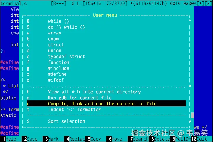 上面是一些常用的代码片段,中间是编译运行选项,还有一些格式化,查询帮助等命令,这个 User Menu 针对不同的文件后缀展现不同的内容,关键是,完全可以配置,你可以使用各种宏配置你的程序的编译运行规则,配置入口在 Menu->Options->Menu File,当然,这里你需要写几行配置文件了,不过十分简单,可以参考已有的。
