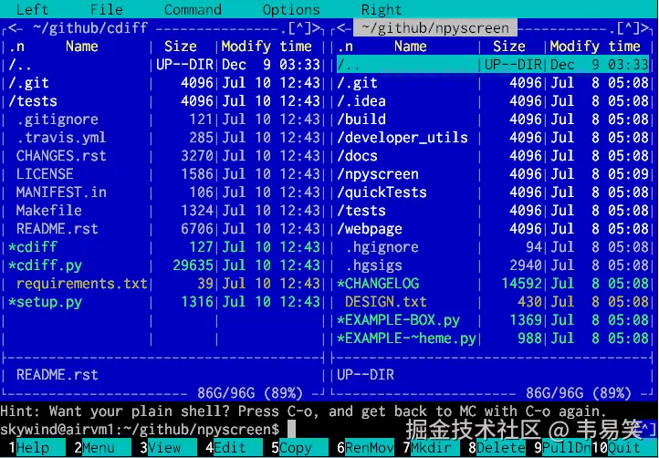 即便能舒适的呆在终端命令行里工作的人,有时候面对有些事情,也会感到烦躁,比如浏览一个目录的结构和里面文件内容,比如从源文件夹选择拷贝一批特定的文件到目标文件夹,这时候你需要 mc ,对就是前面 mcedit 的父项目 midnight commander ,安装方法同 mcedit: