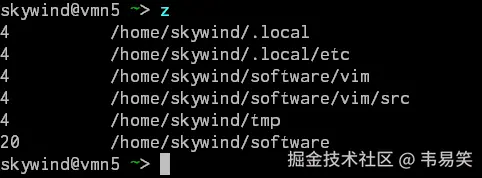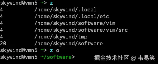 比如所有历史路径都包含 o ,那么 z o 就会跳转到权重最高的 ~/software 目录中。使用:“z -l foo" 可以列出包含 foo 的所有历史路径: