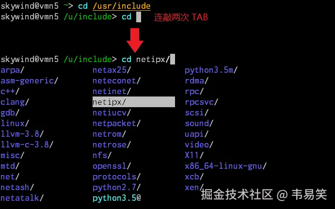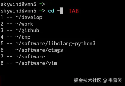 输入 cd 后面加一个减号后,按一次 tab 马上就列出本次登陆后去过的最近几次路径,接着根据下面的提示输入数字按回车就过去了,比如输入: