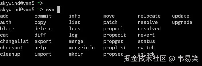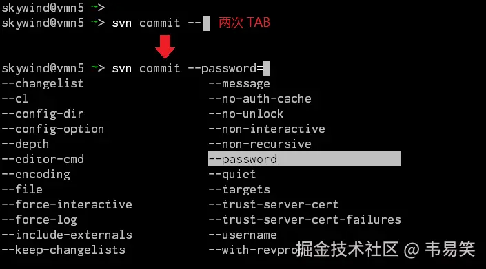 命令参数补全更不在话下,输入 svn 后面按 TAB: