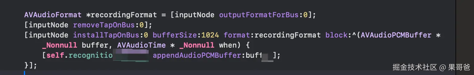 因为是崩溃在installTapOnBus函数,这里指的是语音的输入节点,创建监听器,监听音频输入流,并通过block回调进行处理。