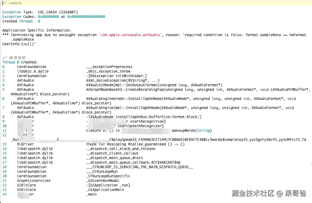由于项目中使用了语音识别功能,该功能也带来了AVAudioEngine的录音崩溃问题,该崩溃偶现,出现概率相对较低,具体崩溃堆栈如下: