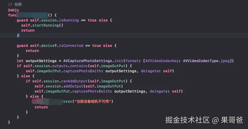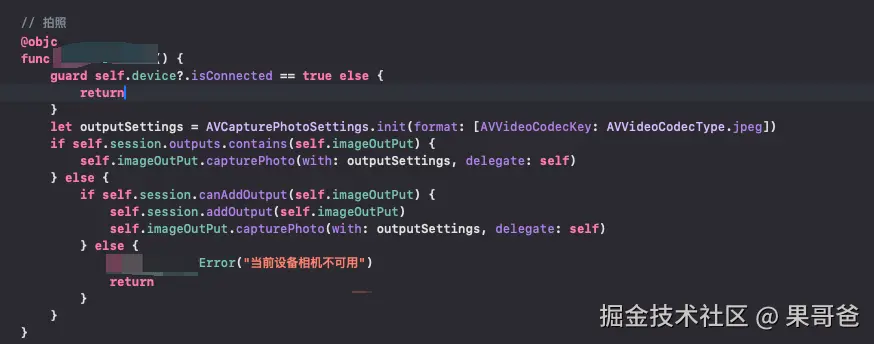 因为这个类及功能是另外同事写的,所以在了解了该功能相关的代码逻辑以及进一步深入了解了AVCaptureSession、AVCaptureDevice等类的作用后。我将怀疑定位到了如下这段代码,
