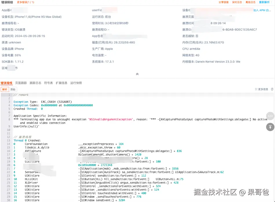 由于项目中使用了自定义相机功能,该功能也带来了这个崩溃,该崩溃偶现,具体崩溃堆栈如下: