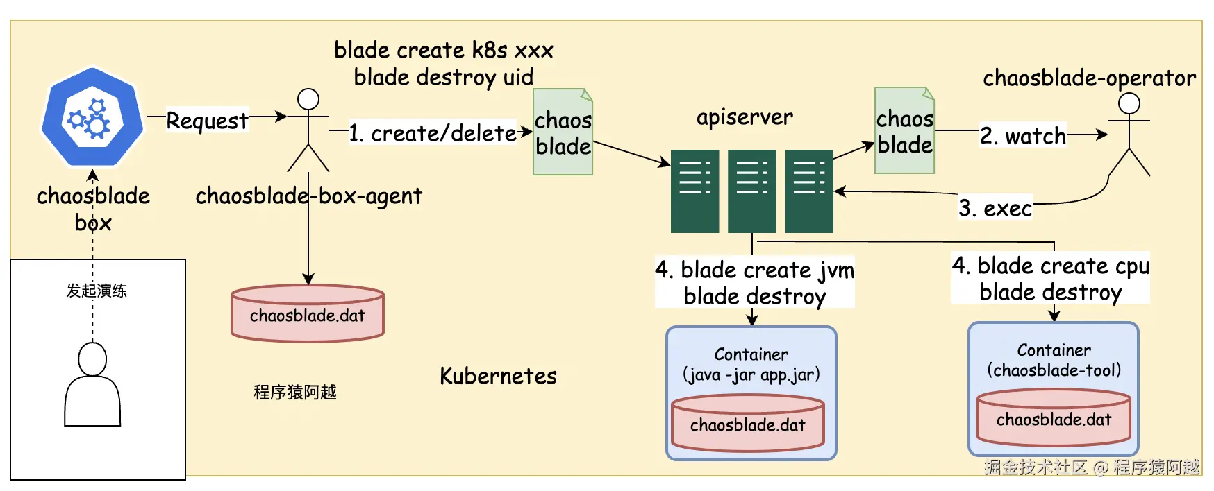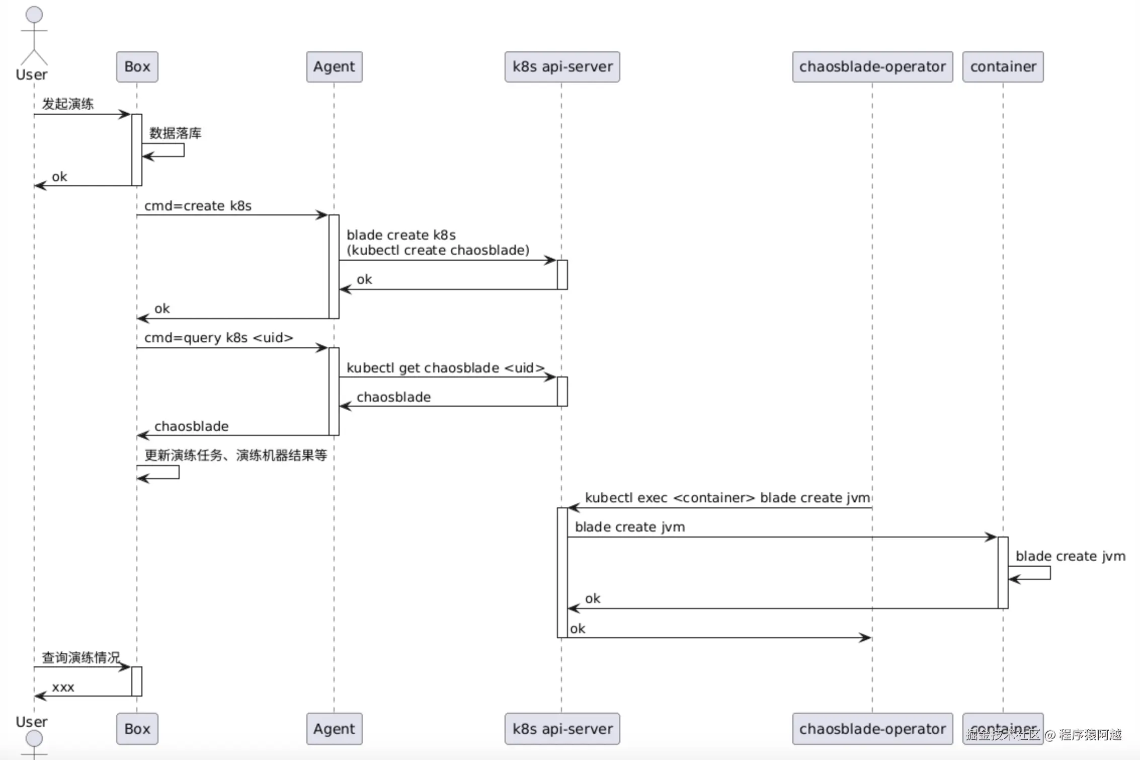 在k8s模式下,agent探针部署在k8s集群中,box下发指令,agent在本机执行blade create k8s命令。
