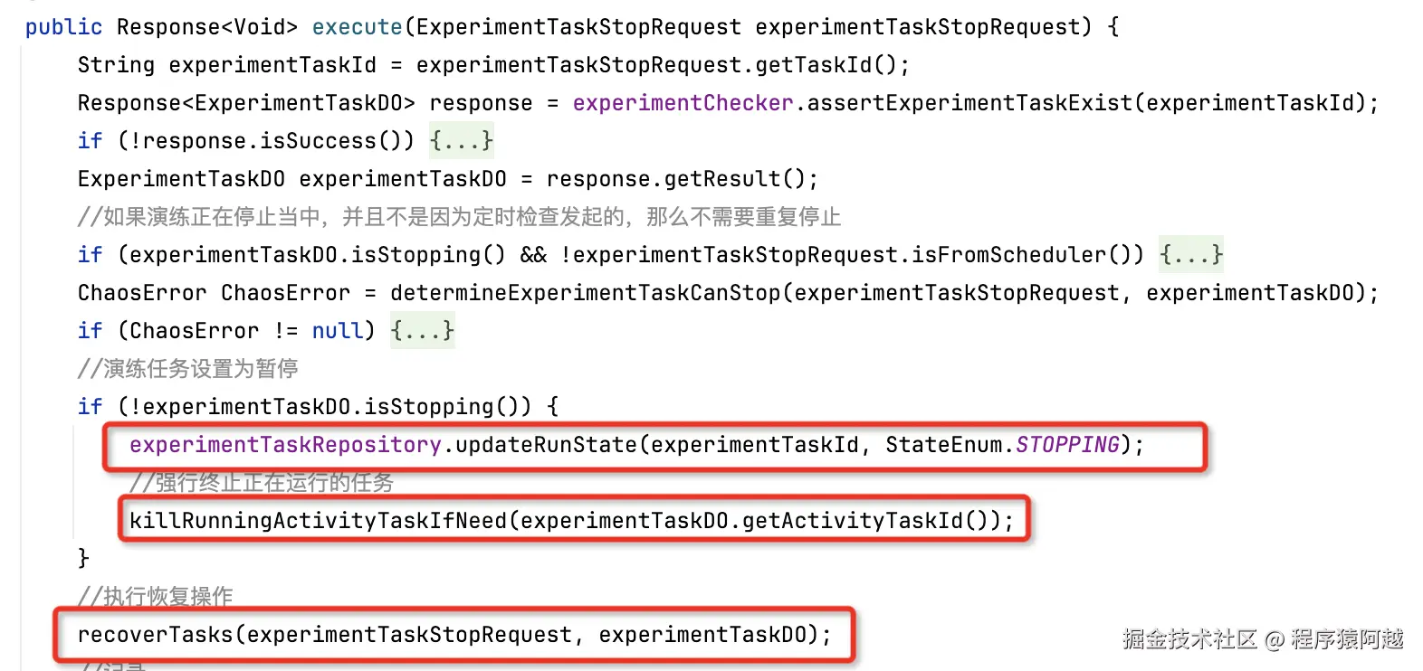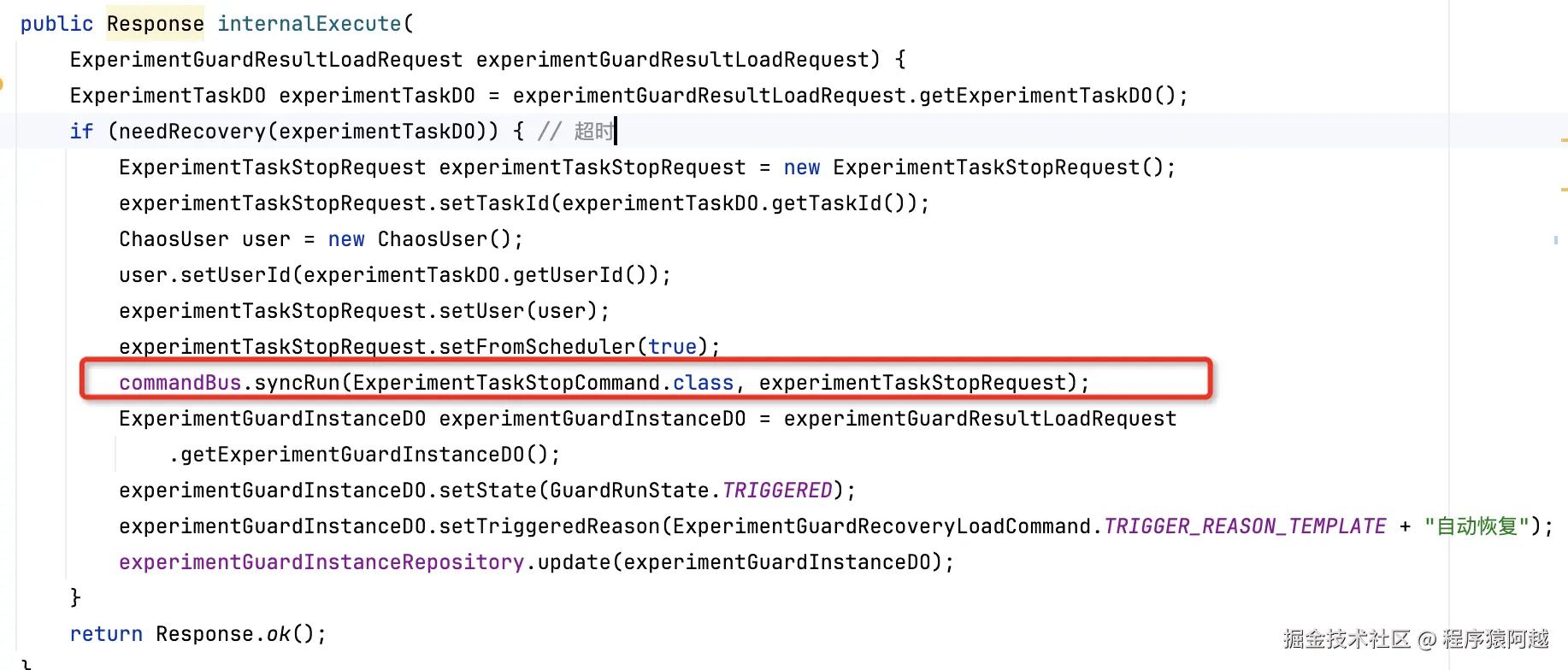 ExperimentAutoRecoveryLoadCommand#internalExecute:超时自动恢复守护实例,如果发现实验任务超时,会触发stop指令,直接终止演练任务。(见手动推进-终止)