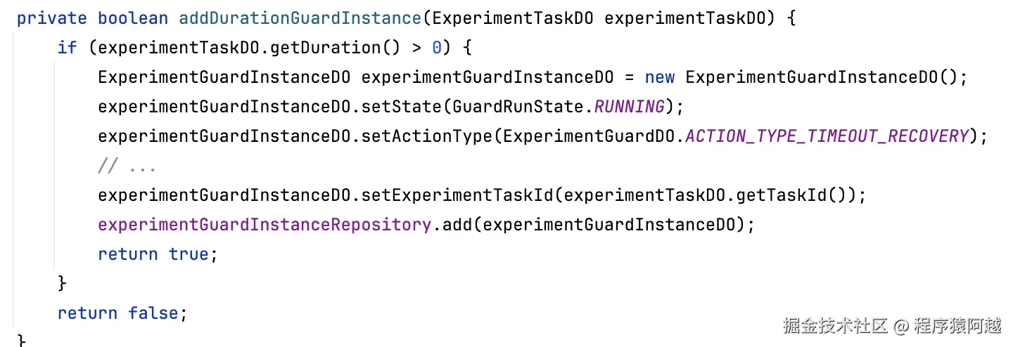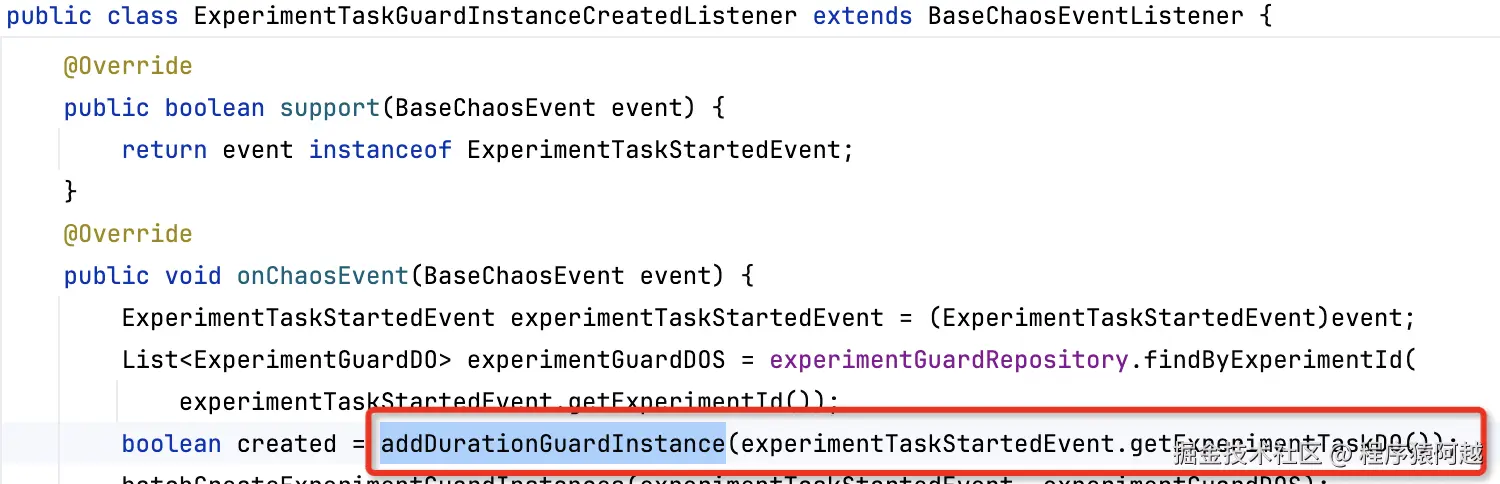 ExperimentTaskGuardInstanceCreatedListener#addDurationGuardInstance:实验任务创建完成(发起演练) 后,会创建一个实验守护实例experiment_guard_instance。