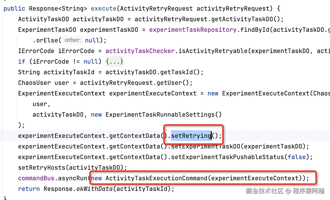 ActivityTaskRetryCommand#execute:重试会查询活动任务下需要重试的机器,设置上下文Retrying,异步执行注入。(还是ActivityTaskExecutionCommand)