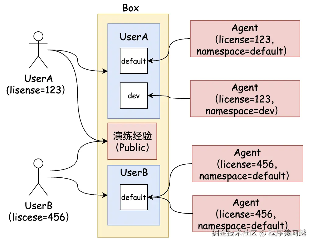 每个用户注册会颁发一个license,agent启动需要指定注册到哪个用户(license)的哪个namespace下。