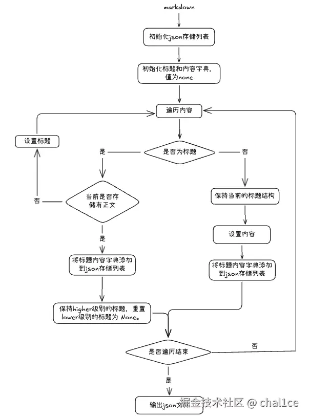 而在输出markdown之后,因为有一级标题二级标题正文等内容,所以很容易对其进行结构化,下面是对markdown内容结构化存储的一种方案: