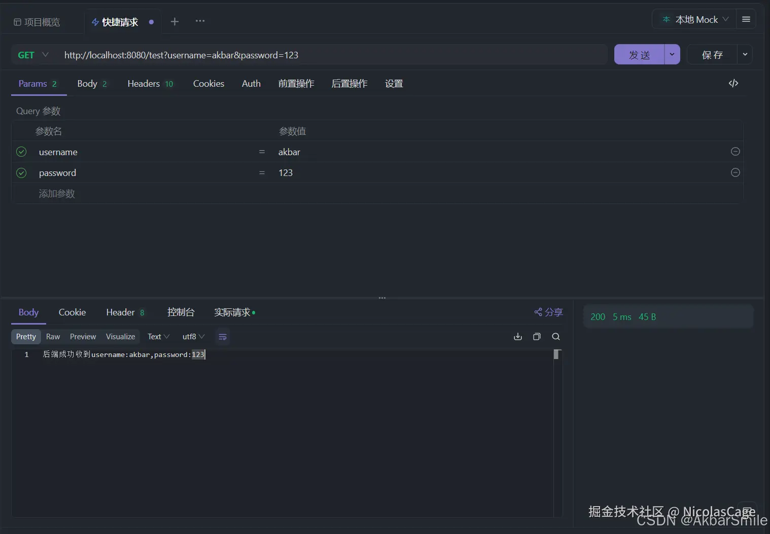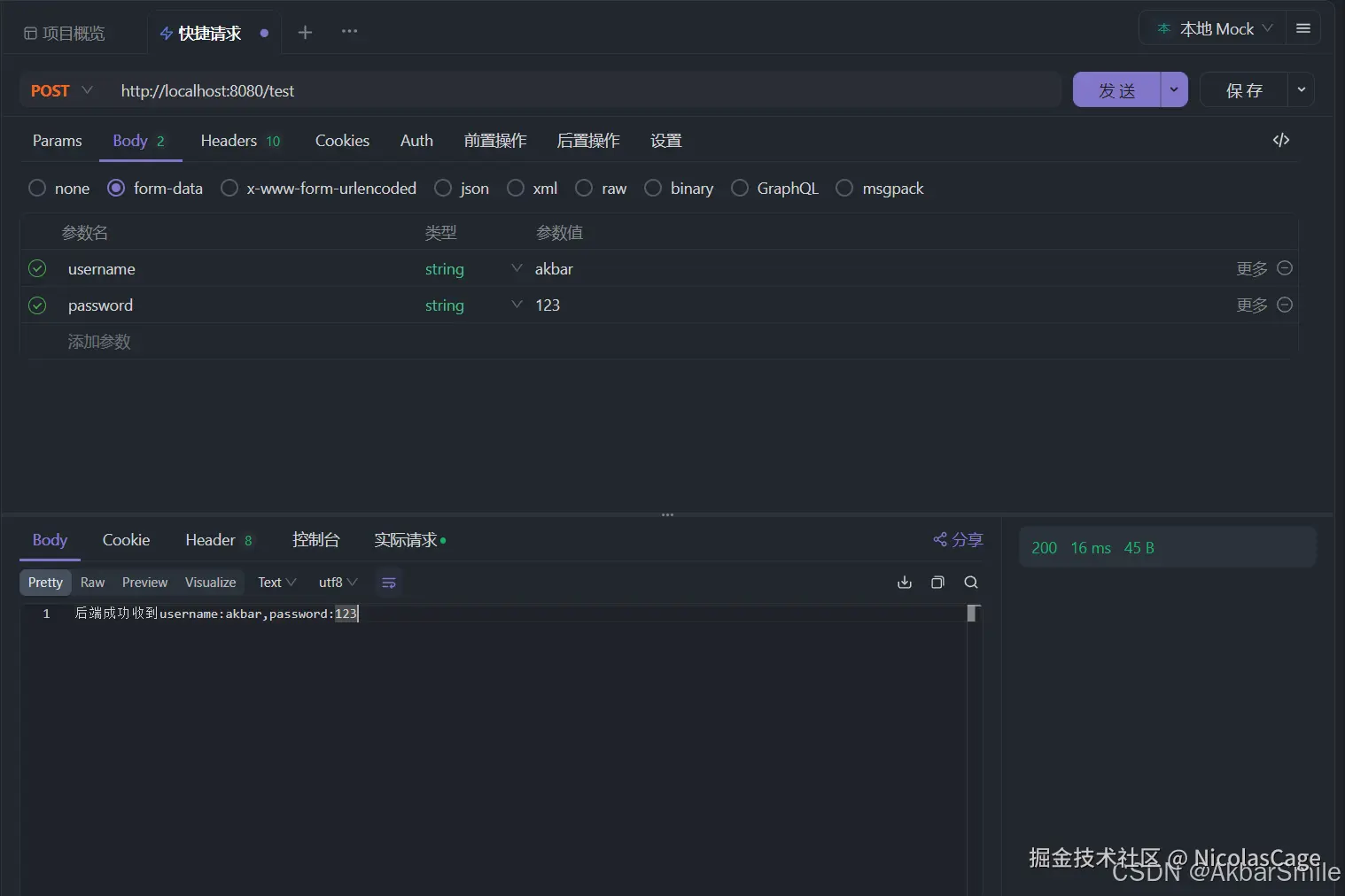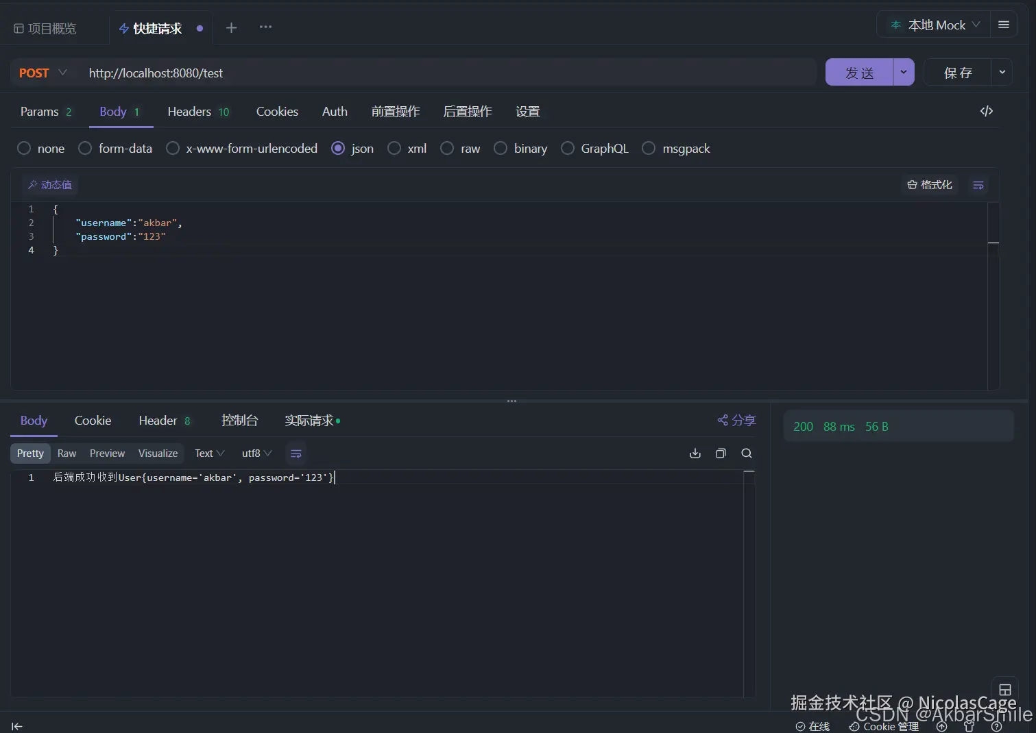 因为前端发送的时json字符串格式的对象(我暂时就这么理解的),所以后端接受要用对应的对象接受,比如user对象,然后别忘了用@RequestBody注解。