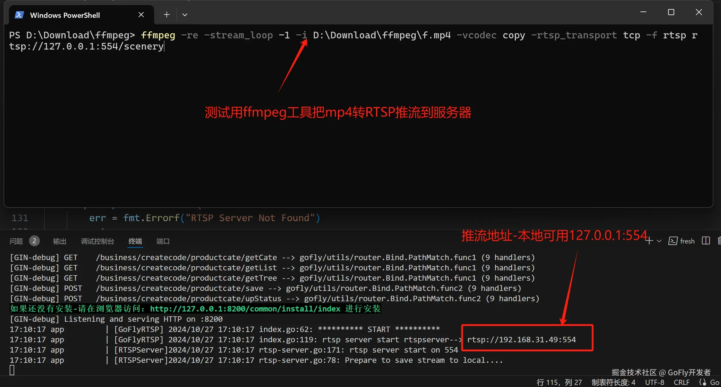 启动Go服务后,在终端看到RTSP服务地址,测试我们用ffmpeg工具来推送RTSP流,如下图,推流命令如下