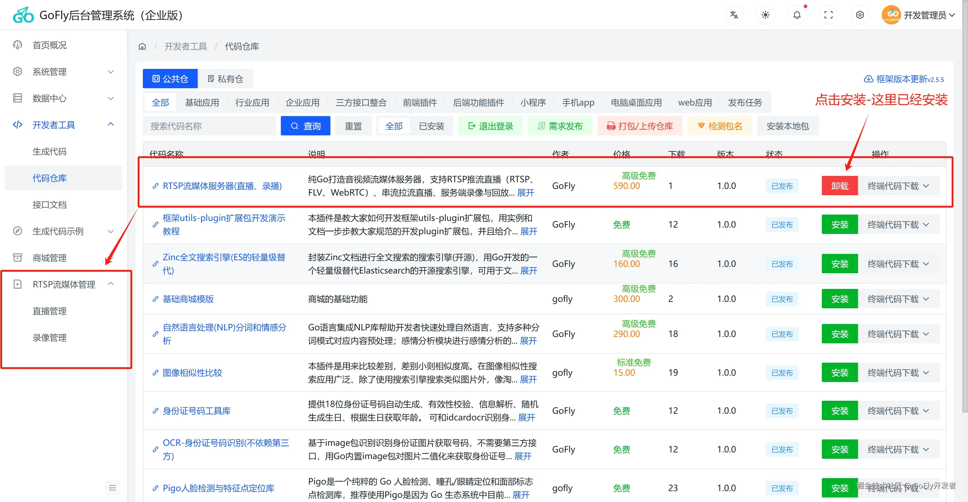 获取代码有两种方式1.到社区代码市场下载,2.是在管理后台代码仓直接安装,如下图: