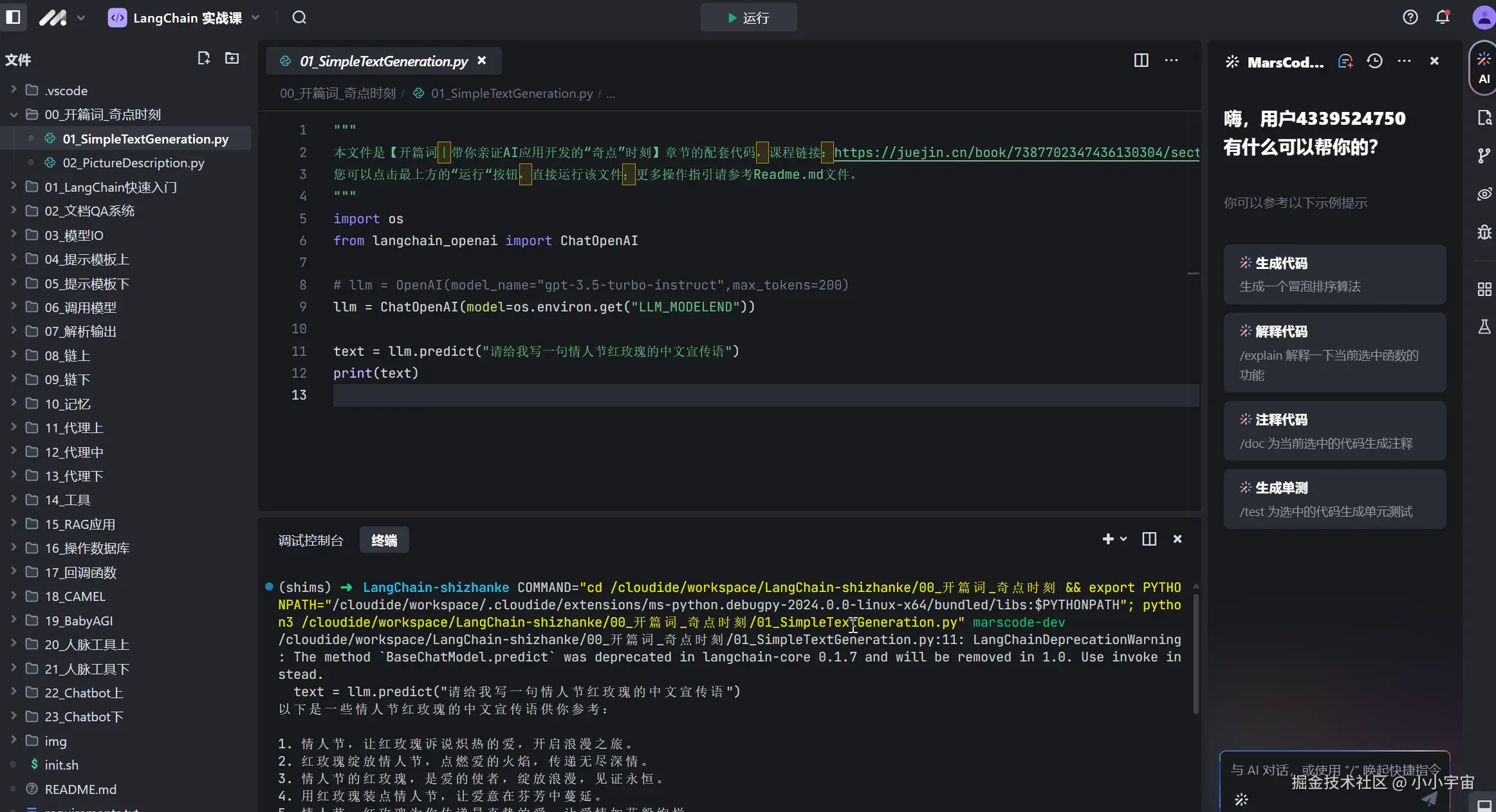 调用了之前创建的 llm(即 ChatOpenAI 实例)的 predict 方法,向 OpenAI 语言模型发送了一个请求,请求内容是让模型写一句关于情人节红玫瑰的中文宣传语。模型会根据这个请求生成相应的文本内容,并将结果返回给 predict 方法,然后这个返回值会被赋值给 text 变量。