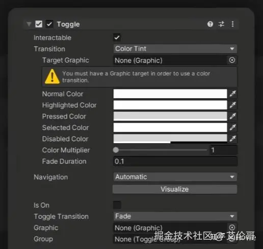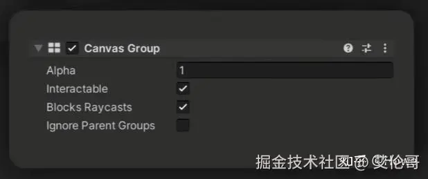 用于控制场景中Canvas的可见性和交互性。Canvas是Unity中的UI元素容器,Canvas Group可以控制Canvas的alpha透明度、是否可交互、是否可见等属性,方便开发者在运行时动态控制UI元素的表现。例如,可以使用Canvas Group来实现UI元素的渐隐渐显、禁用或启用等效果。