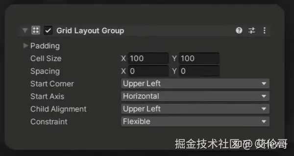 Grid Layout Group可以设置子元素之间的间距、子元素的大小、子元素的对齐方式等参数,还可以自动调整子元素的位置和大小,以适应不同的屏幕尺寸和分辨率。