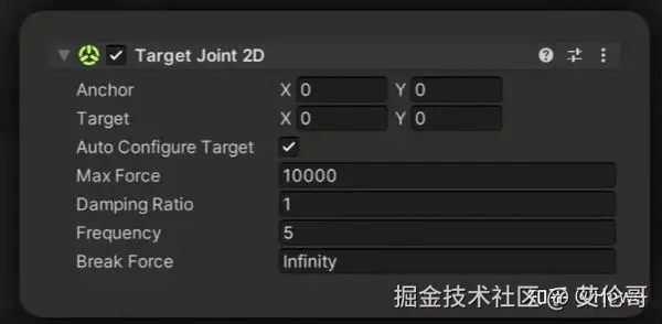 总的来说,Target Joint 2D是实现游戏物理效果的一个非常有用的组件,可以让开发者轻松地实现跟踪效果,从而实现各种有趣的游戏场景。
