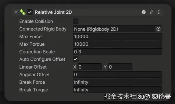 Relative Joint 2D还提供了一些其他的属性,如最大力和最大扭矩,可以控制连接物体之间的力和扭矩。开发者还可以设置连接物体的最大角度和最大速度,以限制它们的相对运动。