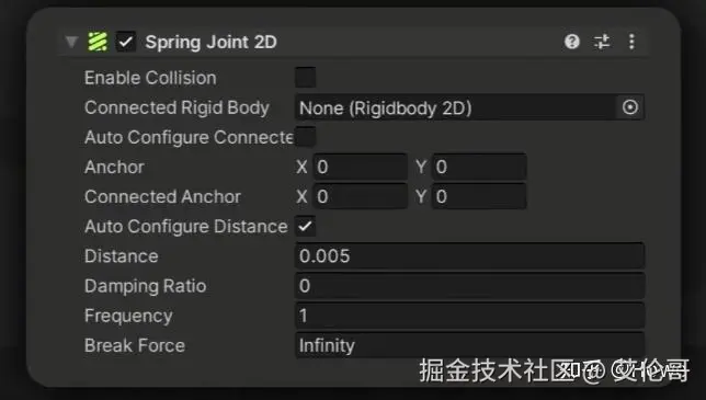 用于模拟两个游戏对象之间的距离约束,使得它们之间的距离保持不变。它可以模拟物理学中的距离效应,使得两个游戏对象之间的运动产生约束。