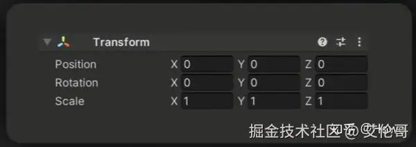 Transform 可以控制游戏对象的位置、旋转和缩放等变换操作。它是游戏对象的基础组件之一,可以通过修改其属性来实现游戏对象的移动、旋转和缩放等操作。其中,位置属性控制游戏对象的世界坐标,旋转属性控制游戏对象的旋转角度,缩放属性控制游戏对象的缩放比例。