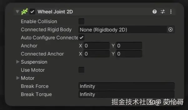 除了基本的车轮运动效果外,Wheel Joint 2D还支持多种参数设置,例如连接的刚体、轮轴半径、最大力矩等。开发者可以根据游戏需求调整这些参数,以实现更加精确的车轮运动效果。