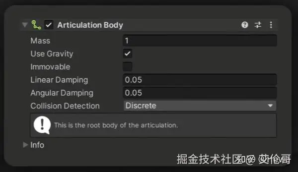Articulation Body提供了许多属性和方法,如关节类型、关节限制、质量、摩擦系数、弹性系数等,使开发人员可以轻松地创建和管理物理效果。它还可以与其他Unity组件配合使用,如Collider、Rigidbody、Joint等。