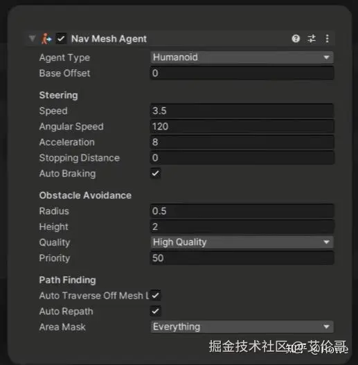 用于实现游戏对象的导航功能。Nav Mesh Agent通常用于模拟各种导航效果,例如角色移动、AI行为等。