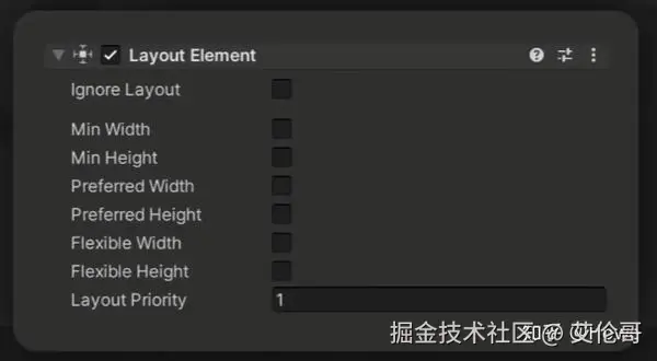 Layout Element可以设置最小、首选和最大尺寸的宽度和高度,还可以设置UI元素的最小和最大宽高比。它也可以设置是否强制将UI元素的尺寸限制在最小和最大值之间。