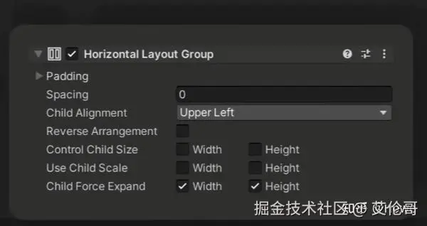 Horizontal Layout Group可以设置子元素之间的间距、子元素的大小、子元素的对齐方式等参数,还可以自动调整子元素的位置和大小,以适应不同的屏幕尺寸和分辨率。
