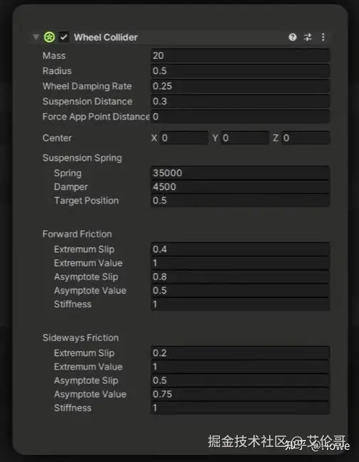 总的来说,Wheel Collider是实现车辆运动效果的一个非常有用的组件,可以让开发者轻松地模拟车辆的运动过程,从而实现各种有趣的游戏场景。