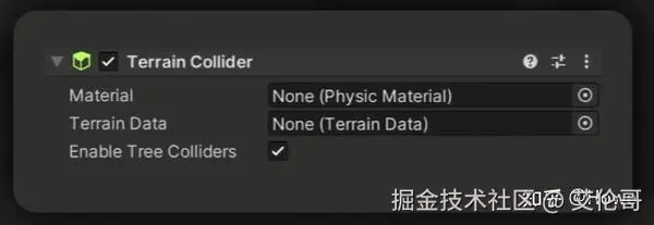 用于在场景中的地形(Terrain)上添加碰撞检测功能。当一个物体与Terrain Collider发生接触时,就会触发碰撞事件,从而可以实现各种游戏场景的交互效果。