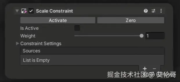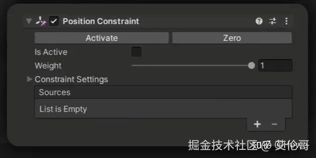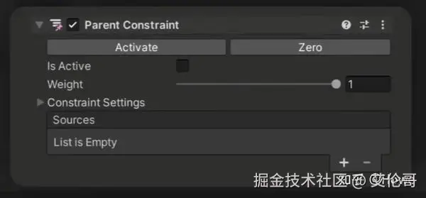 Parent Constraint用于将游戏对象约束到另一个游戏对象上,使其跟随、旋转或缩放。例如,当一个角色在移动时,它的武器需要跟随它的手部位置,这时候就可以使用Parent Constraint将武器约束到手部位置。