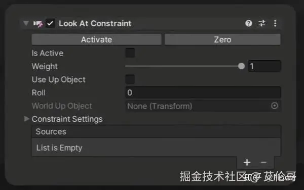 它可以将游戏对象约束到另一个游戏对象上,使其始终朝向目标。与Aim Constraint不同的是,Look At Constraint可以实现更加自然的朝向效果,可以在不同的方向上约束对象,例如只在水平方向上约束、在垂直方向上约束、在任意方向上约束等。