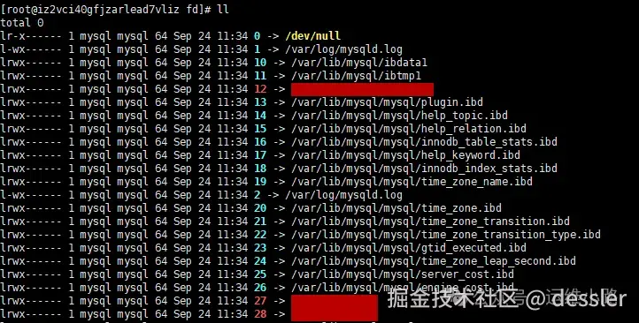 可以看到mysql进程的目录,可以看到它打开的日志文件,数据库文件等,和前面讲的lsof命令打开文件有异曲同工之妙。这里还有很多红色显示为deleted的文件。我们在讲Linux进阶命令-lsof命令的时候说过,如果文件被删除;这个文件如果正在被其他程序打开,文件是不会真删除的。从而导致删除文件未释放空间。基于该情况,我们设计了2个课题:
