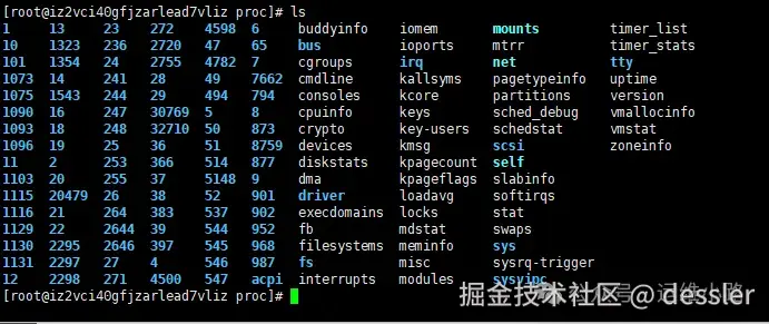 - 关于进程的信息,除一些固定的目录和文件,里面还有很多以数字命名的目录,这里的每个目录都代表了一个进程,每个进程也就会一个对应的pid目录名字。