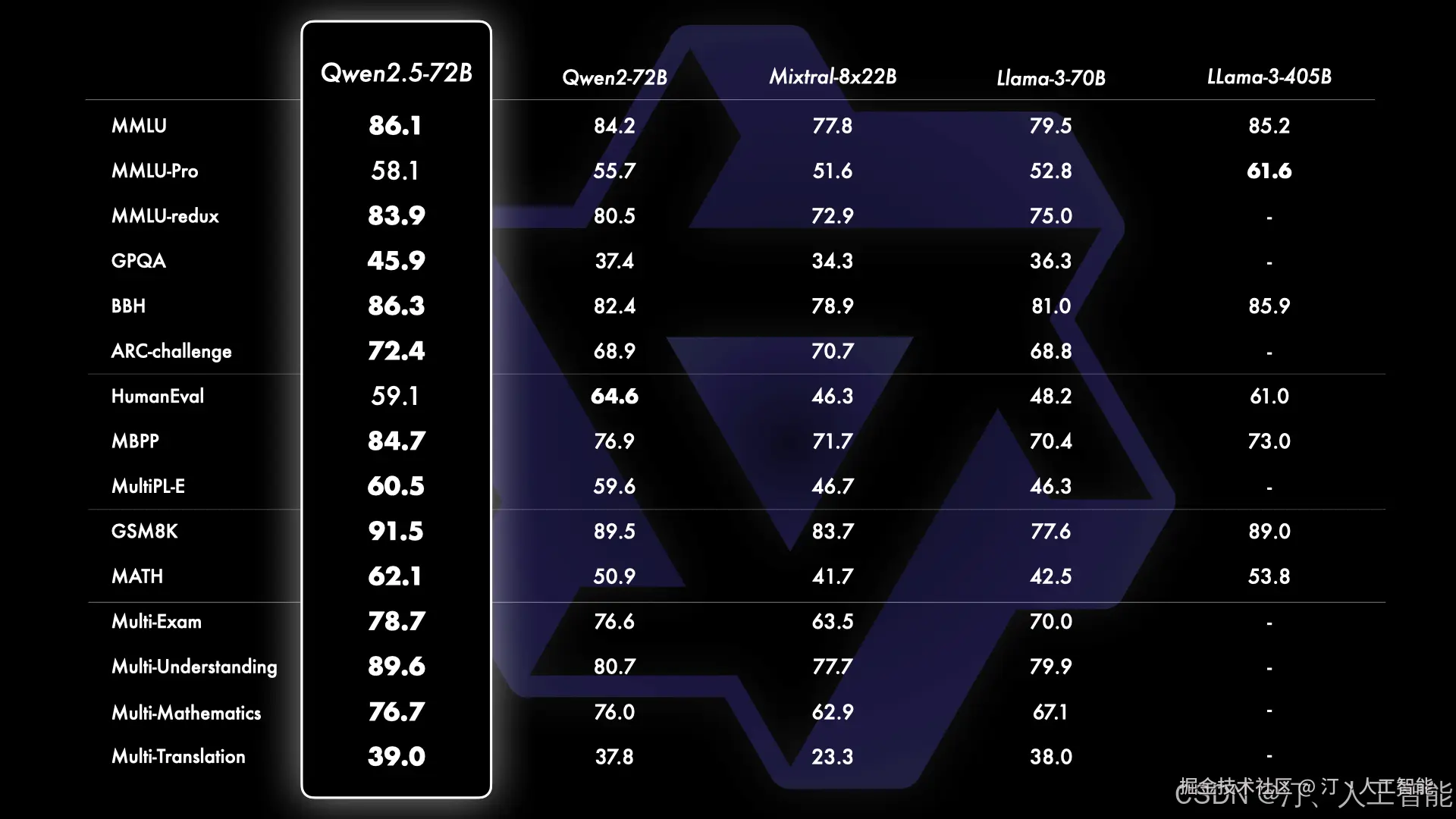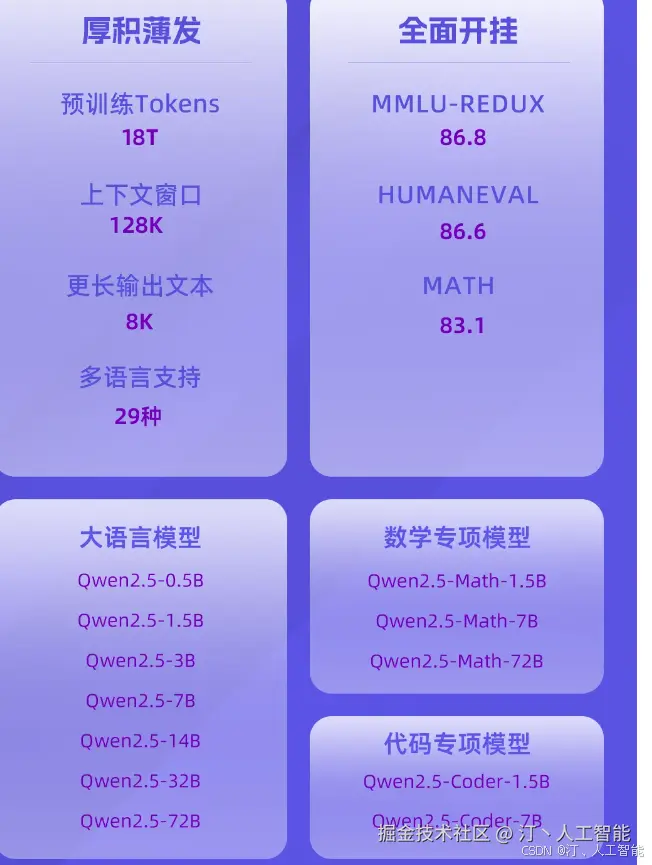 易于使用的仅解码器稠密语言模型,提供 0.5B 、1.5B 、3B 、7B 、14B 、32B 和 72B 共 7 种参数规模的模型,并且有基模型和指令微调模型两种变体(其中 “B” 表示“十亿”, 72B 即为 720 亿)
