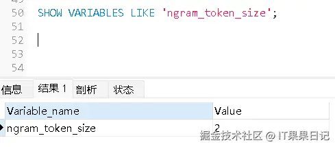 可以使用以下语句查询 ngram_token_size配置。