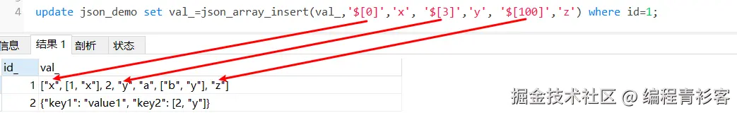 update json_demo set val_=json_array_insert(val_,'$[0]','x', '$[3]','y', '$[100]','z') where id_=1;
