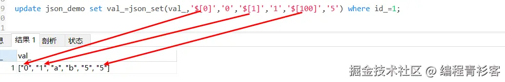 update json_demo set val_=json_set(val_,'$[0]','0','$[1]','1','$[5]','5') where id_=1;