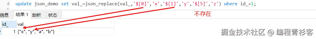 #对JSON数组操作时,第一个path '$[0]',指定插入'x',但因'$[0]'已存在,因此忽略
